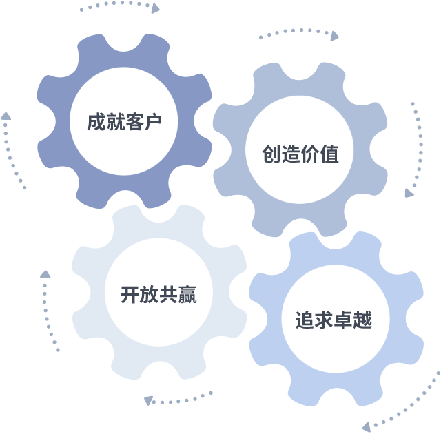 成就客户是一切决策的出发点,创造价值是衡量所有工作的标准,追求卓越是天博做事做人的态度,开放共赢是天博的格局也是最终的结果。价值观的齿轮环环相扣,推动着组织里的每个人不断向前。